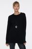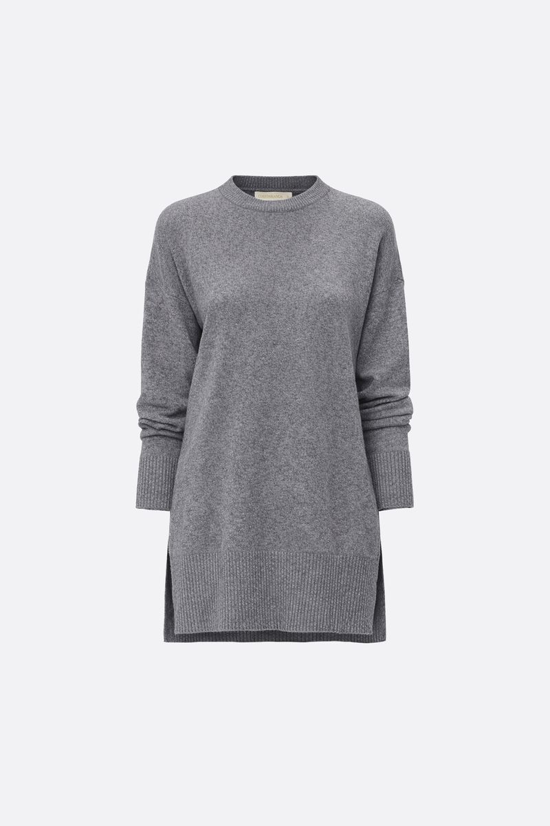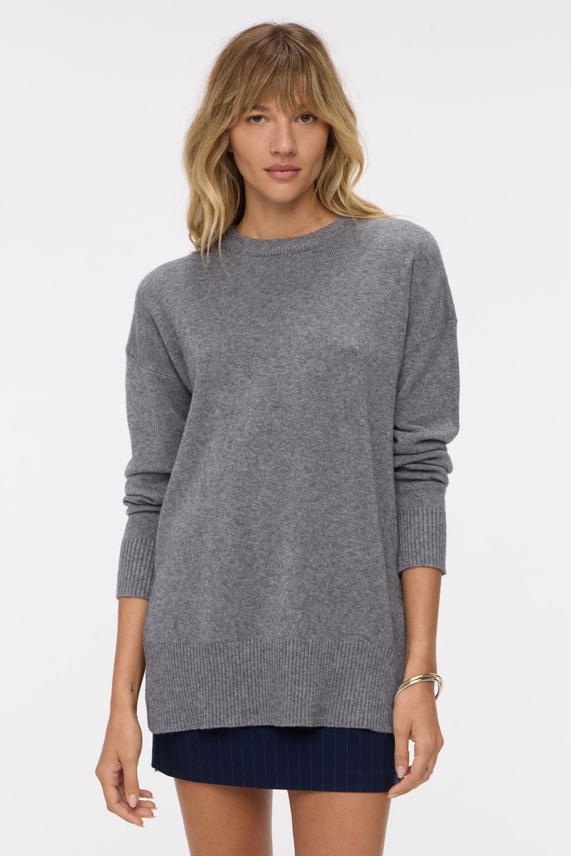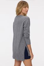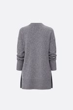 Sweater tejido en punto jersey con escote redondo. La espalda es más larga que el delantero, con un pequeño tajo en el lateral. Las terminaciones de cuello, puños y cintura estan confeccionadas en rib. La modelo está usando talle 42. Composición: 55% Rayón viscosa | 30% Poliamida | 15% Modal