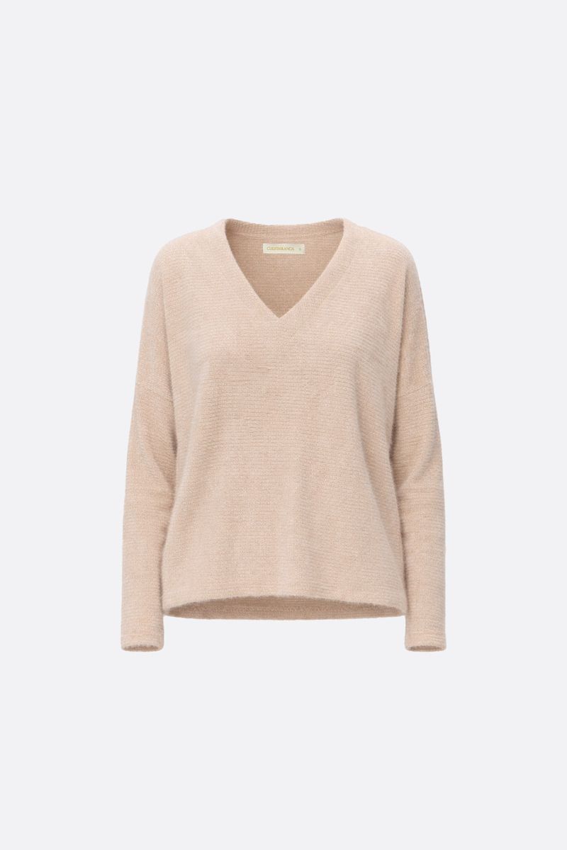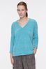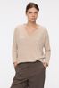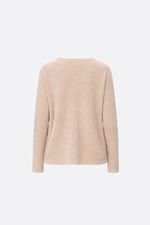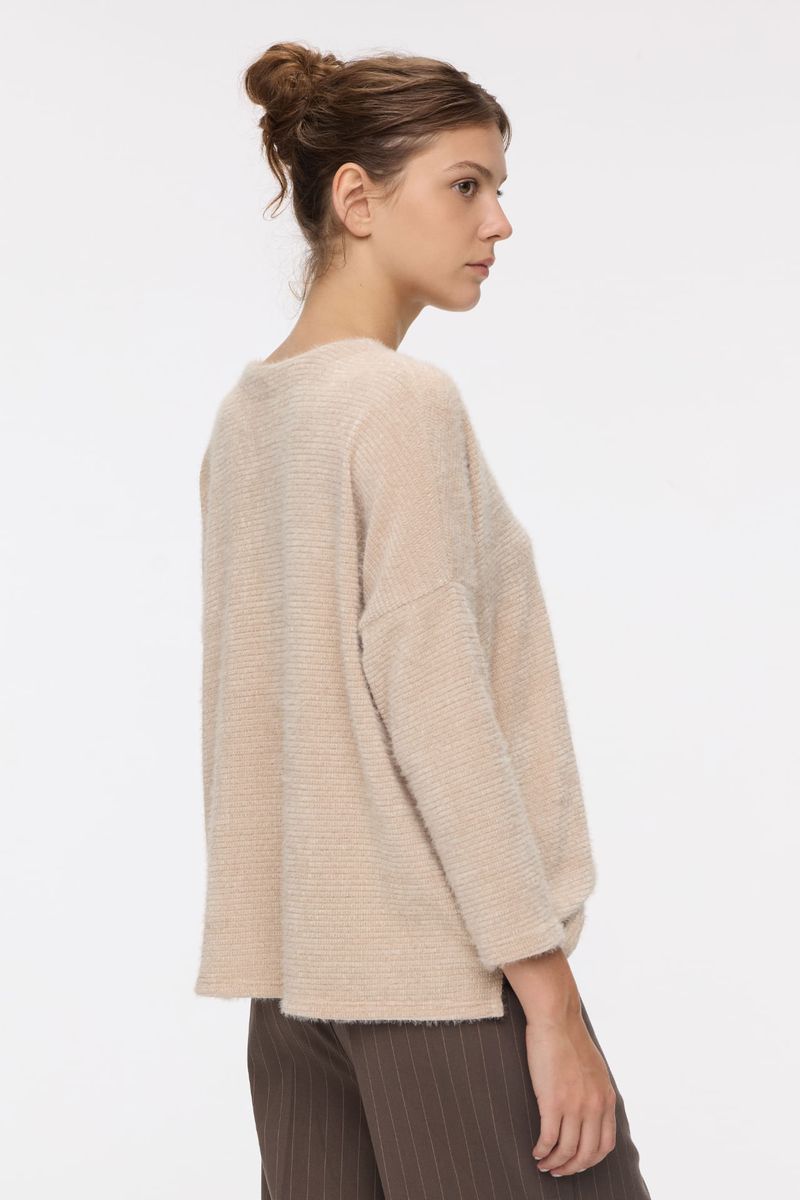 Sweater en lanilla, mangas largas, escote en V, con tajos en los laterales. La modelo está usando talle 42. Composición: 92% Poliétser | 35% Poliamida