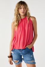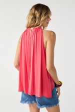 Top liso en crepe, escote con volado y jareta con lazo para atar hacia espalda. La modelo está usando talle 42. Composición: 100% Rayón viscosa