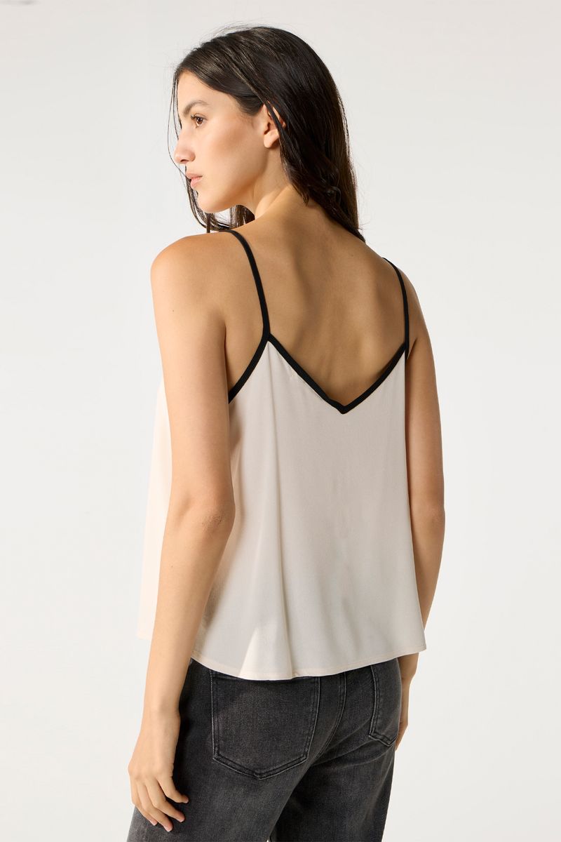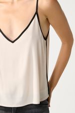 Top liso en crepe con forreria en delantero, escote, sisas y laterales con envivado a contratono. La modelo está usando talle 42. Composición: 100% Rayón viscosa