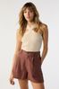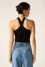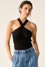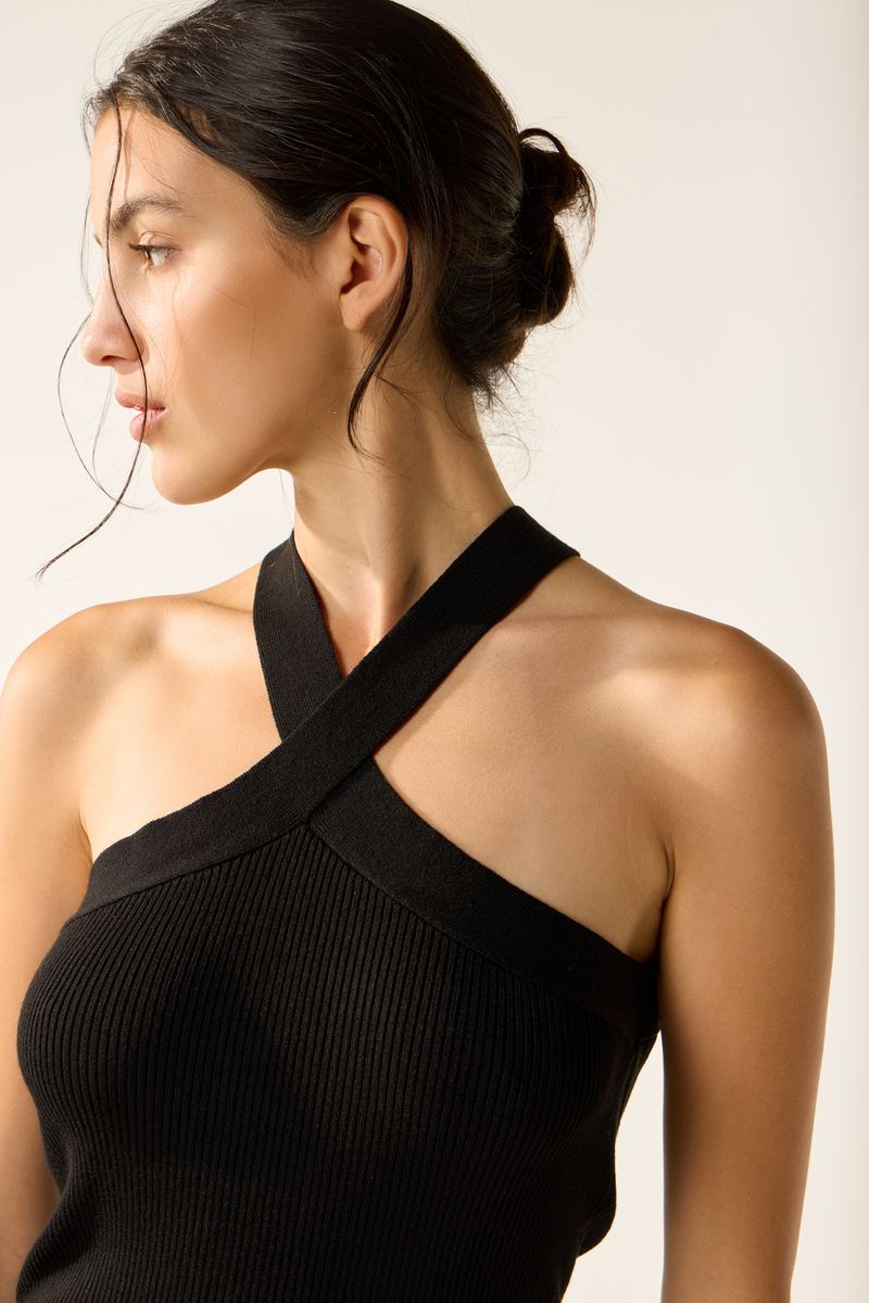 Top tejido sin mangas y cuello cruzado. La modelo está usando talle 42. Composición: 80% Rayón viscosa | 20% Poliamida
