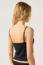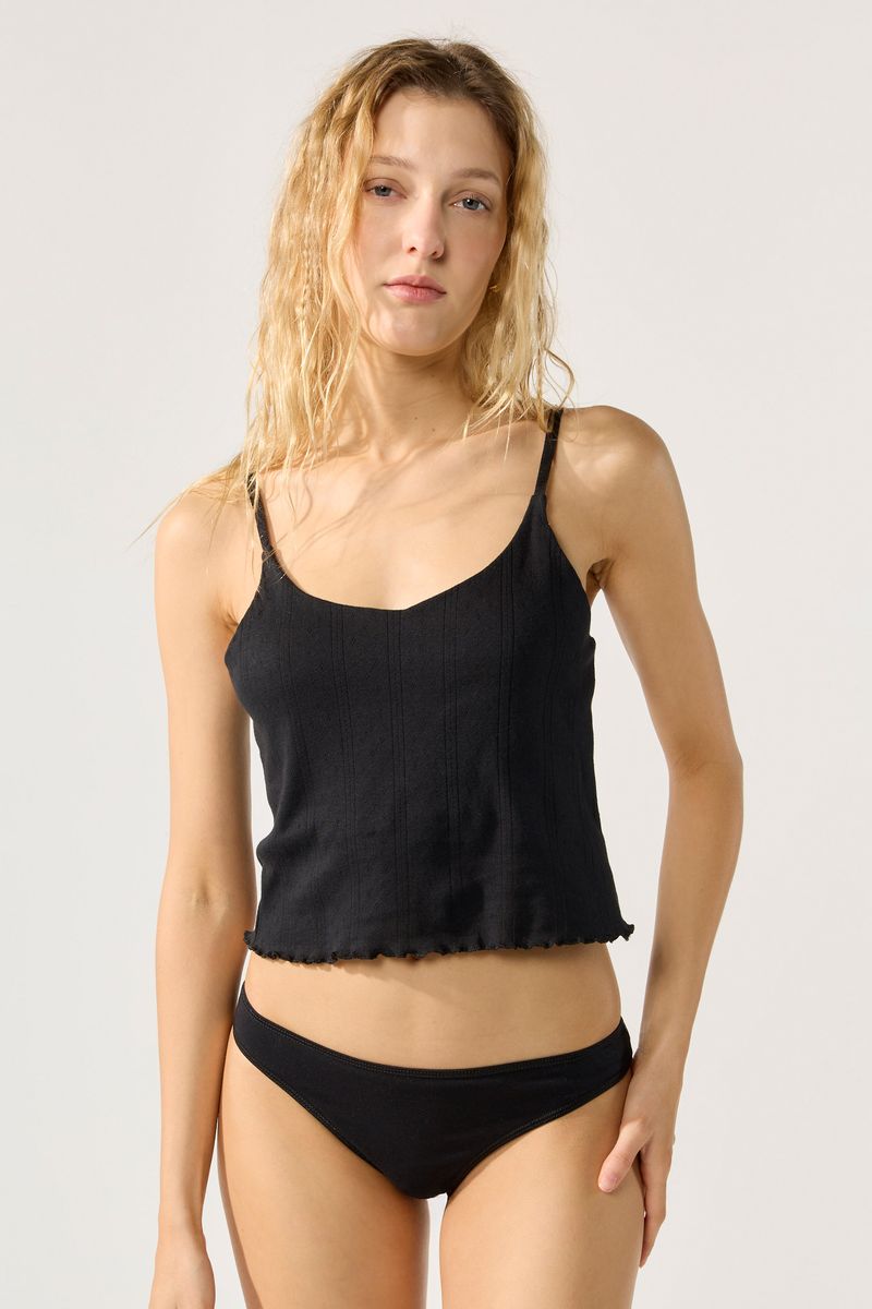 Top escote en v en jersey desagujado con breteles regulables y terminación de ruedo en roulotte. La modelo está usando talle 42 Composición: 100% Algodón