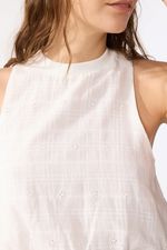 Top sin mangas con escote redondo de broderie liviano. Tiene una silueta balloon delicada y un cierre invisible en el centro espalda. La modelo está usando talle 42. Composición: 100% Algodón