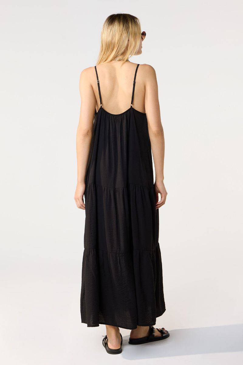 Vestido largo en tela texturada, escote en V y breteles finos regulables. Tiene faldón con frunces en falda. La modelo está usando talle 42. Composición: 85% Rayón viscosa | 15% Nylon