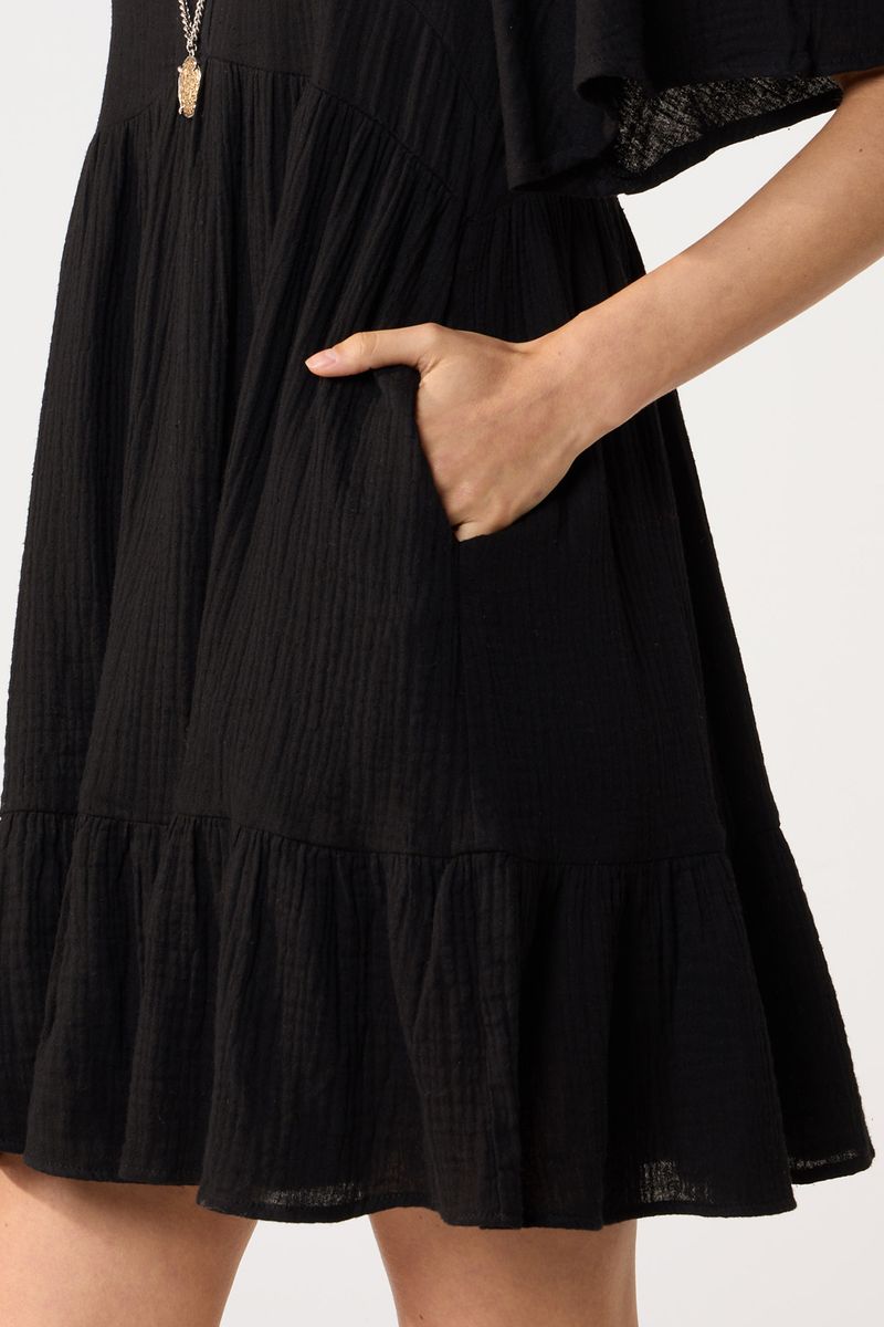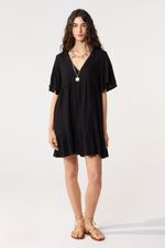 Vestido corto de algodon texturizado. La modelo está usando talle 42. Composición: 100% Algodón