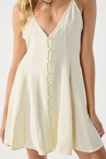 Vestido corto con breteles regulares, tiene hotfix sobre toda la prenda. Acceso por el delantero con botones forrados. La modelo está usando talle 42. Composición: 82% Rayón viscosa | 18% Poliamida