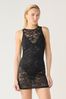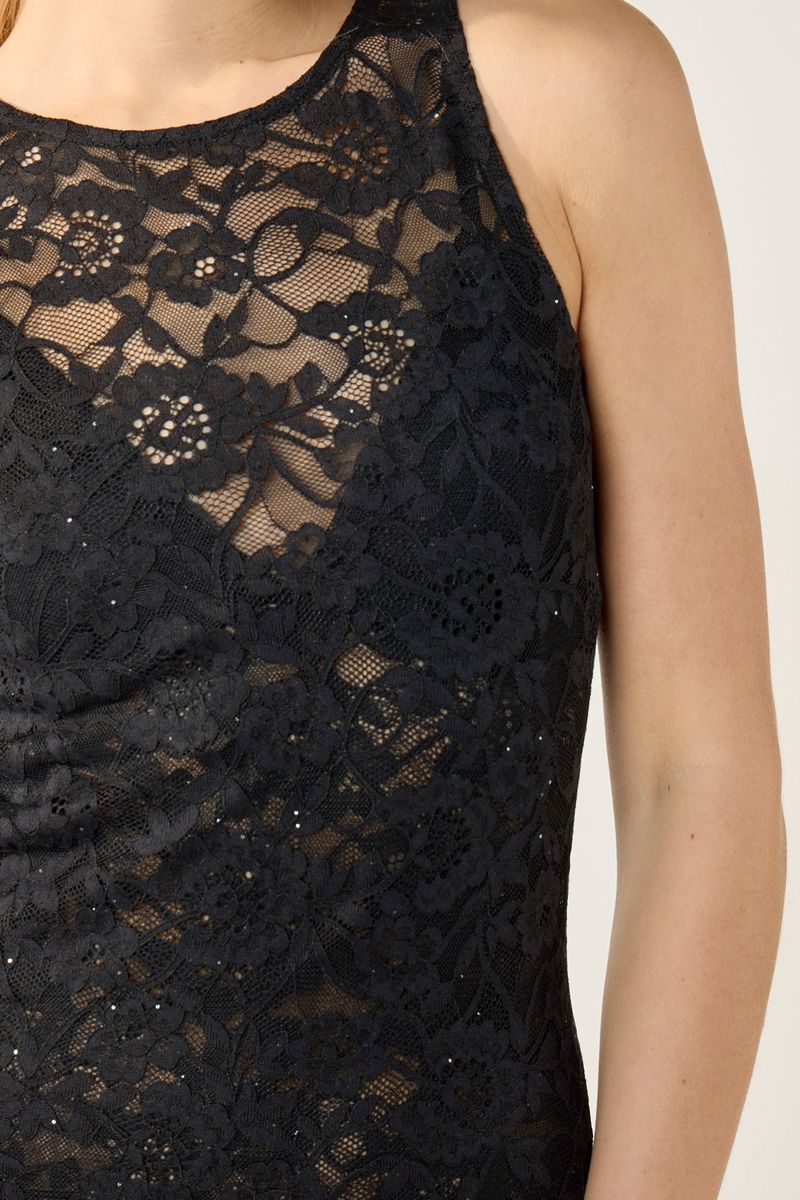 Vestido escote redondo corto al cuerpo en encaje bordado con minis lentejuelas. La modelo está usando talle 42 Composición: 70% Poliamida | 20% Poliéster | 10% Elastano