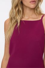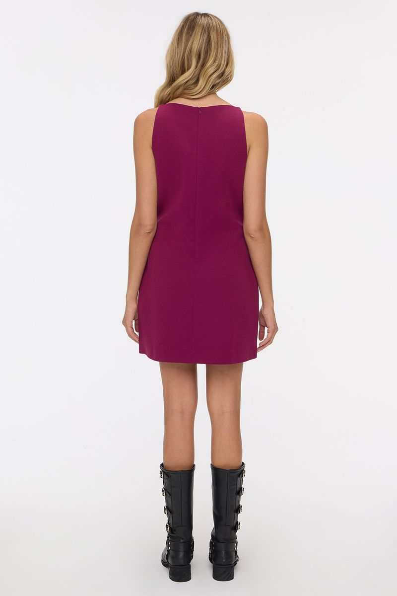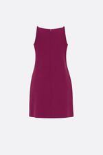 Vestido corto con forrería a tono. Tiene escote recto (tipo halter) y breteles finos. Apertura en espalda mediante un cierre invisible. La modelo está usando talle 42. Composición: Tela Principal: 95% Poliéster | 5% Elastano || Forrería: 100% Poliéster