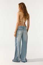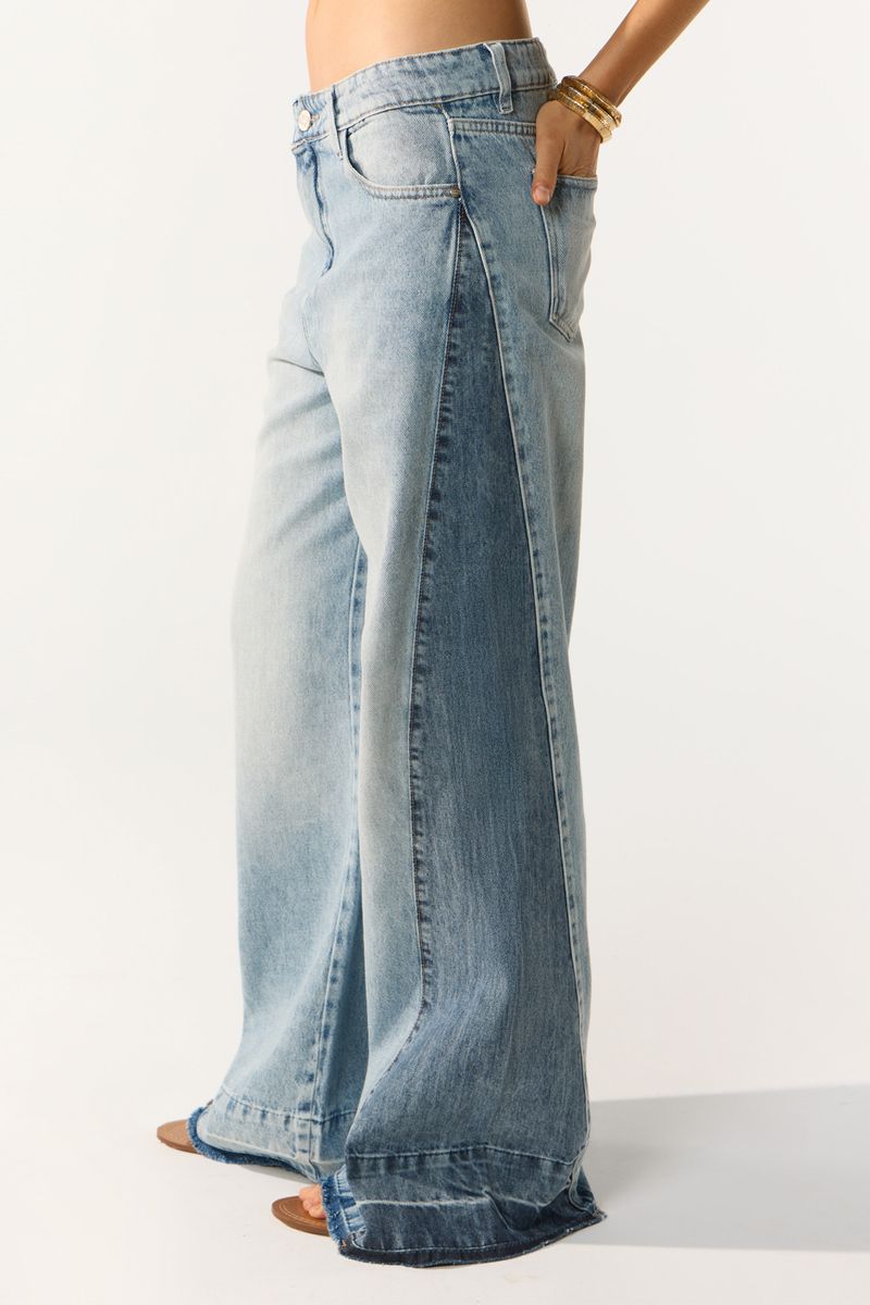 Pantalón 5 bolsillos con combinación de 2 tejidos denim rígido color azul con diferentes intensidades de lavado. Pierna wide tiro alto y detalle de zócalo en ruedo con termianción al corte Hilo camel. La modelo está usando talle 42. Composición: 100% Algodón